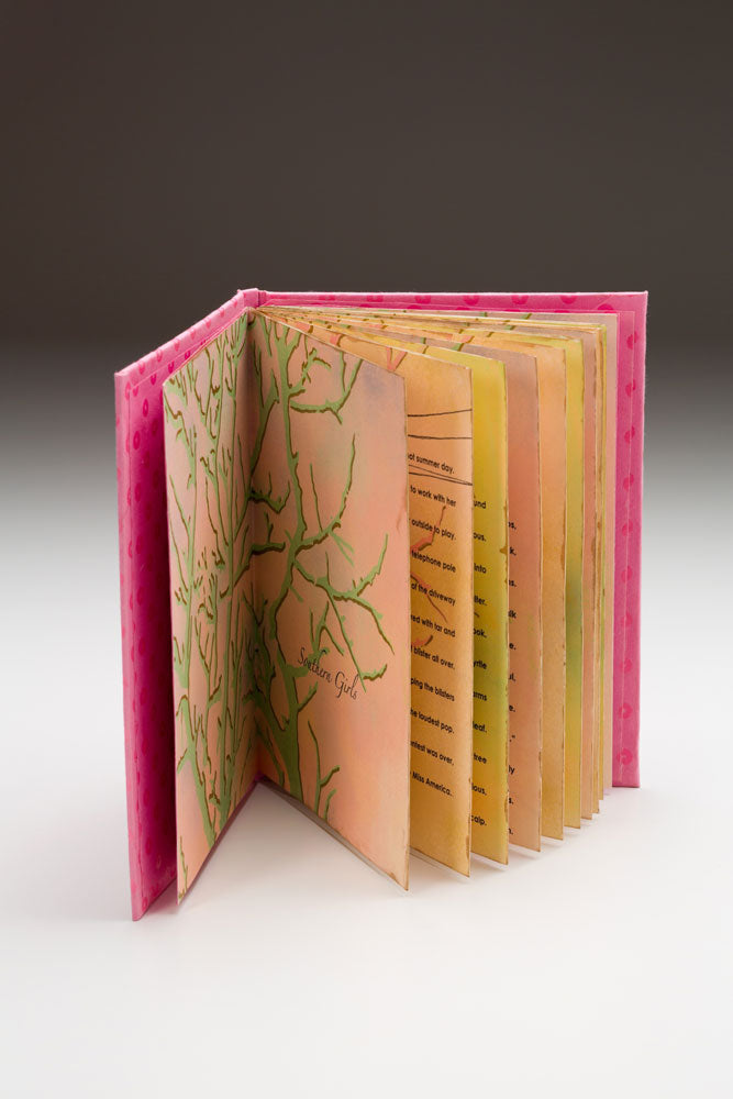The term "book" brings to mind a traditional format with which we are all familiar. An artist's book, by contrast, explores the landscape of that definition and allows pursuit of the limitless directions to which those functions can apply. Devising a structure that creates a visual dialog with the viewer engages one in a process that is both private and public. Perloff works primarily with binder's board and handmade paper, but repurposed items often find expression in her work. Having been born in a large southern city, its heritage and traditions often reside in the content of her work. These personal references often find a broad appeal as they represent universal values or experiences familiar to a wide segment of people.